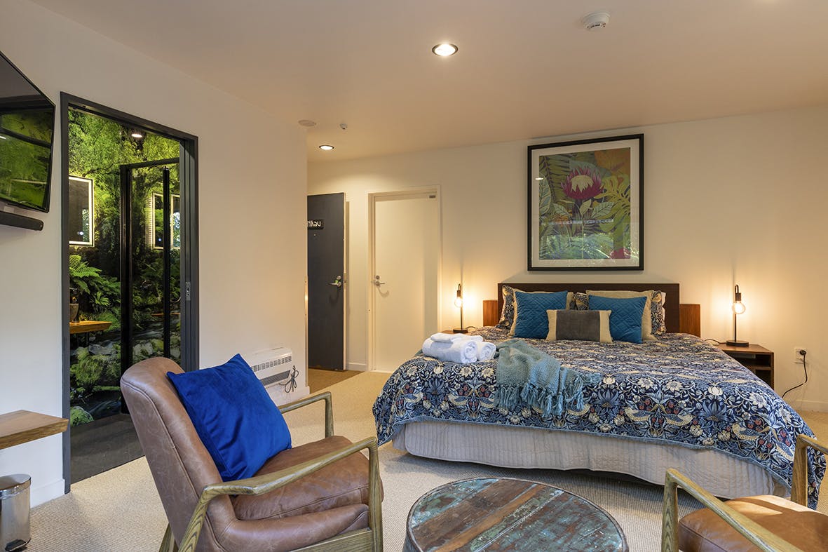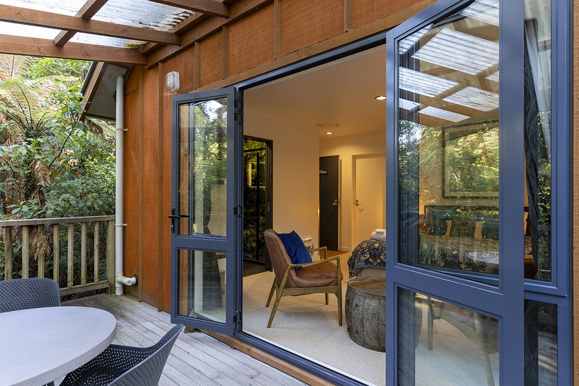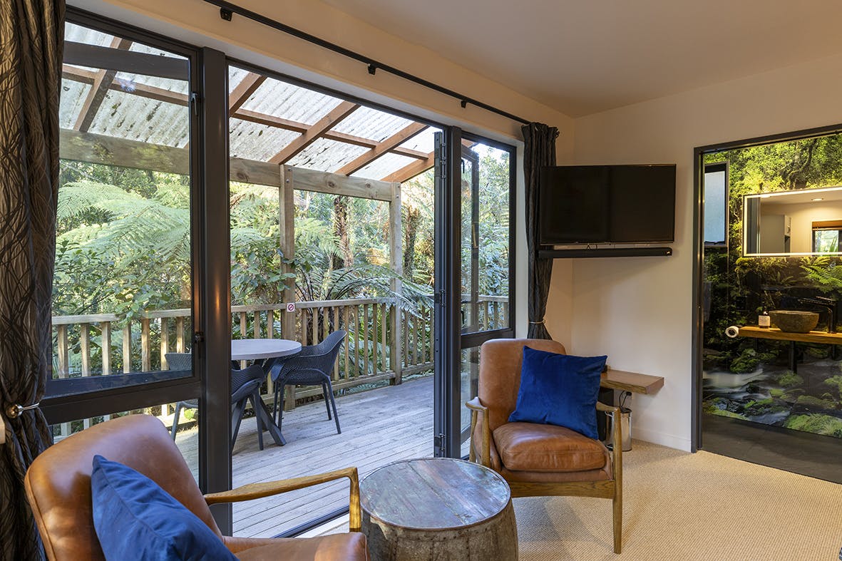 NIkau is a King studio room incorporating a kitchenette including a mini fridge, cooktop, tea and coffee making facilities and microwave. It has an ensuite bathroom and treetop balcony. There is a small seating area for watching tv or dining. There is a king sized bed with the option of 2 singles instead.
