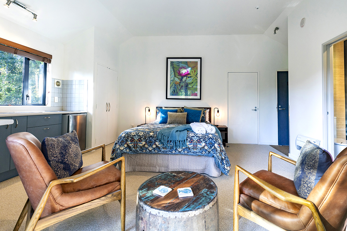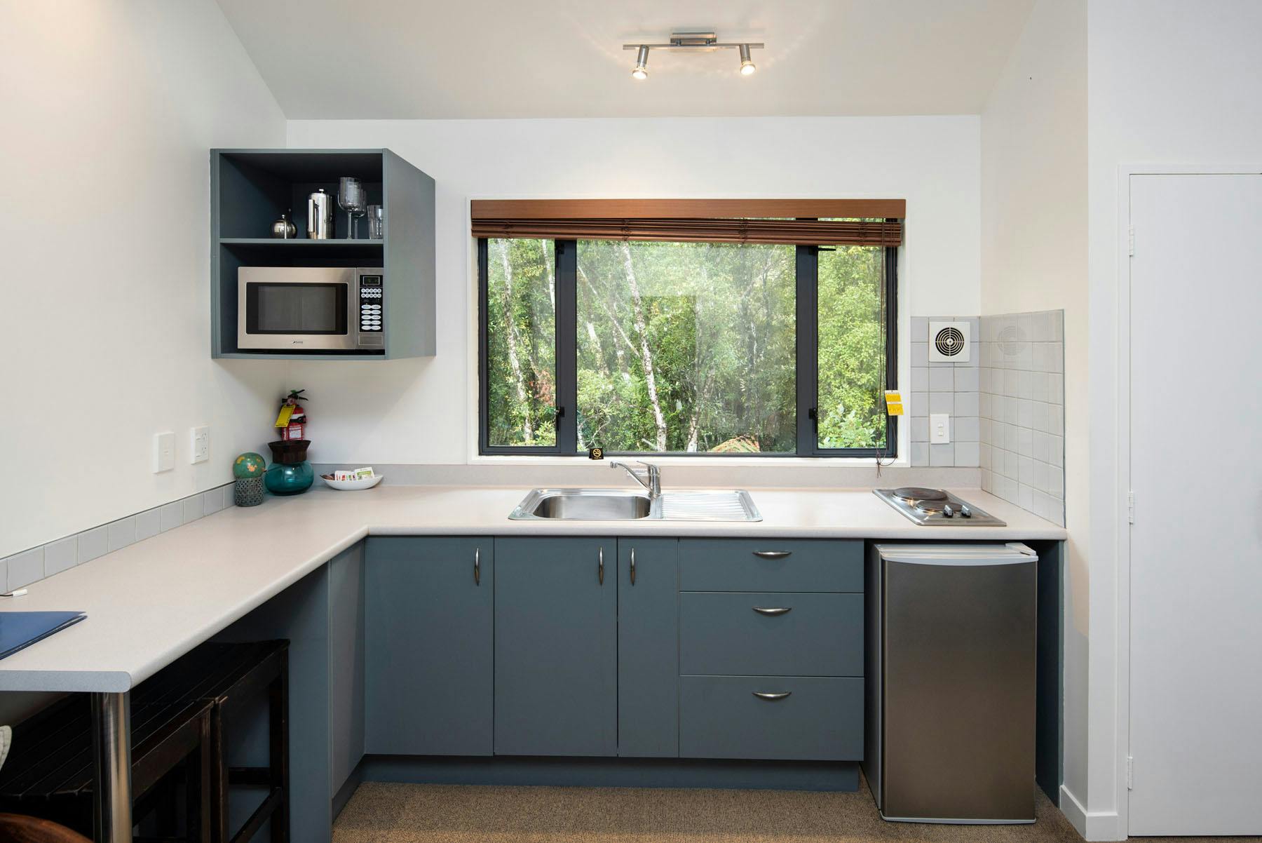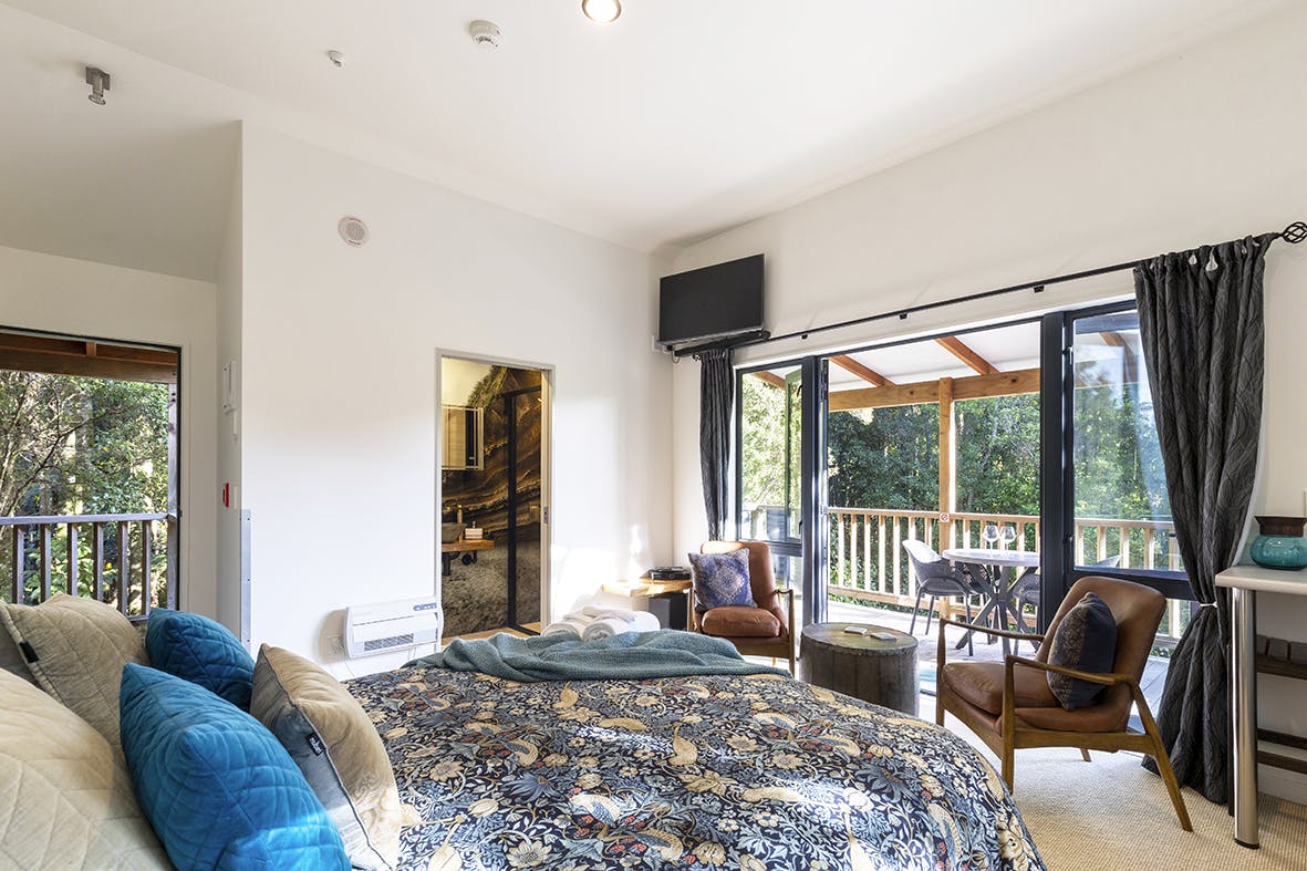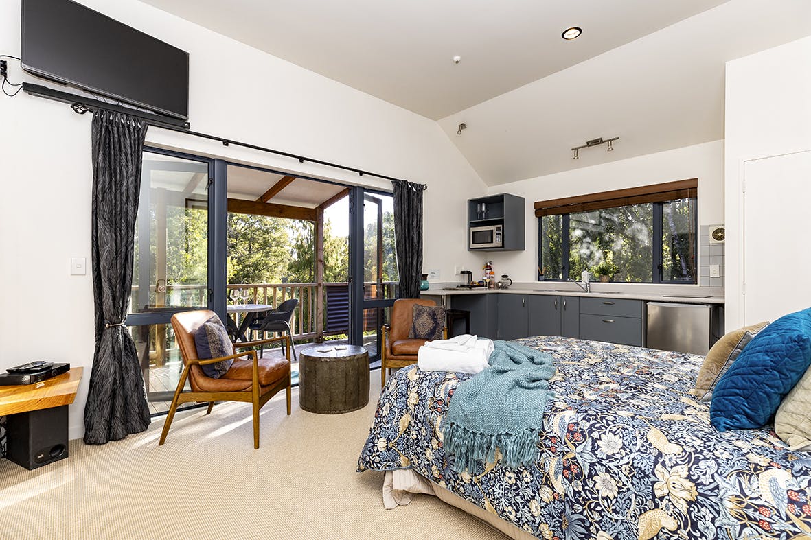 Rimu is a queen studio, incorporating a kitchenette including a mini fridge, cooktop, tea and coffee making facilities and microwave. It has an ensuite bathroom and treetop balcony. There is a small seating area for watching tv or dining.
